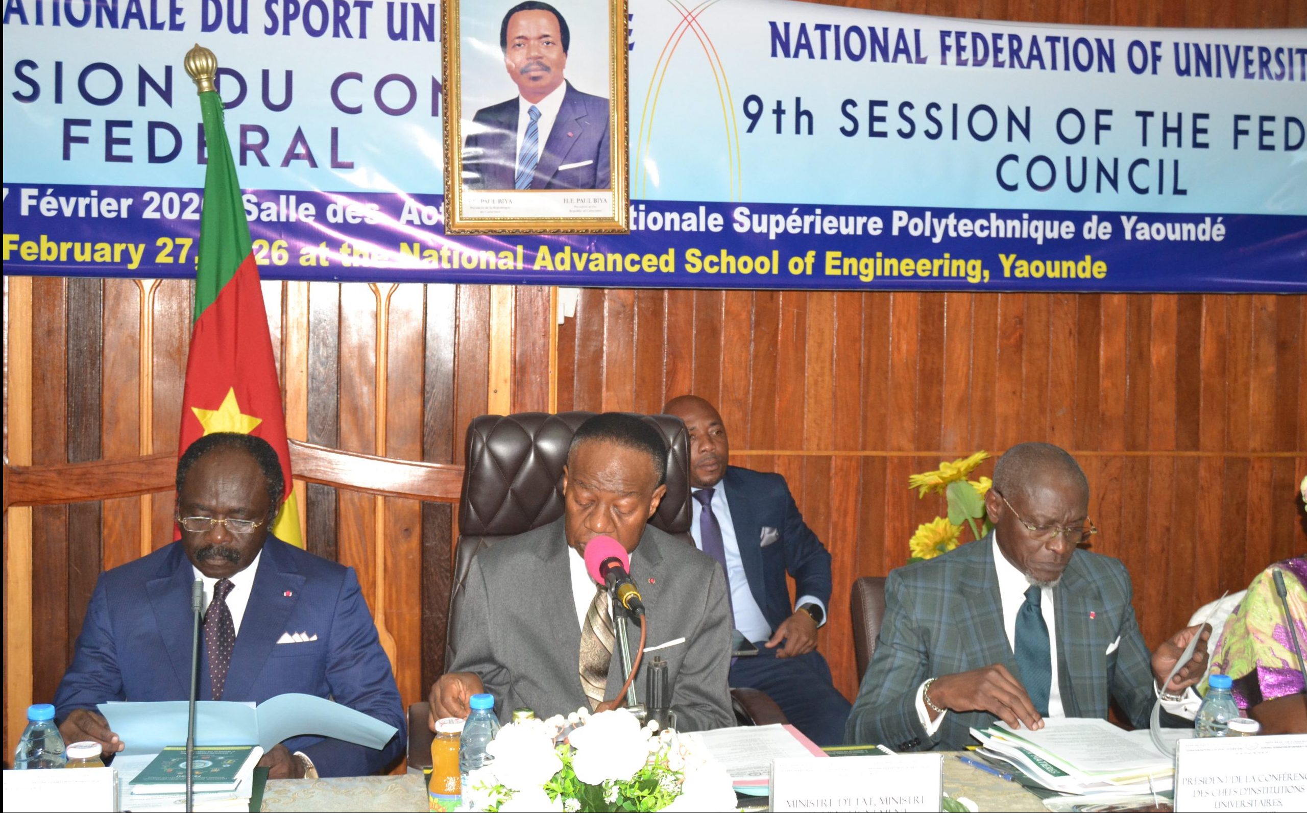 Sous la Très Haute Impulsion de Son Excellence Paul BIYA, Président de la République, Chef de l’État, et mise en œuvre par Monsieur le Premier Ministre, Chef du Gouvernement, Chief Dr Joseph DION NGUTE, la neuvième session ordinaire du Conseil Fédéral de la Fédération Nationale du Sport Universitaire (FENASU) s’est tenue le vendredi 27 Février 2026, dans la salle des actes de l’Ecole Nationale Supérieure Polytechnique de Yaoundé (ENSPY). Cette session a porté sur l’examen des rapports et des comptes de l’exercice 2025, les enjeux stratégiques et les perspectives d’organisation et de développement du sport universitaire au Cameroun, dans un contexte de réforme et de modernisation de la gouvernance universitaire. Les travaux se sont déroulés sous la Présidence effective du Professeur Jacques FAME NDONGO, Ministre d’État, Ministre de l’Enseignement Supérieur, Chancelier des Ordres Académiques, Président du Conseil Fédéral de la FENASU, assisté du Professeur Narcisse MOUELLE KOMBI, Ministre des Sports et de l’Éducation Physique, Vice-Président du Conseil Fédéral.